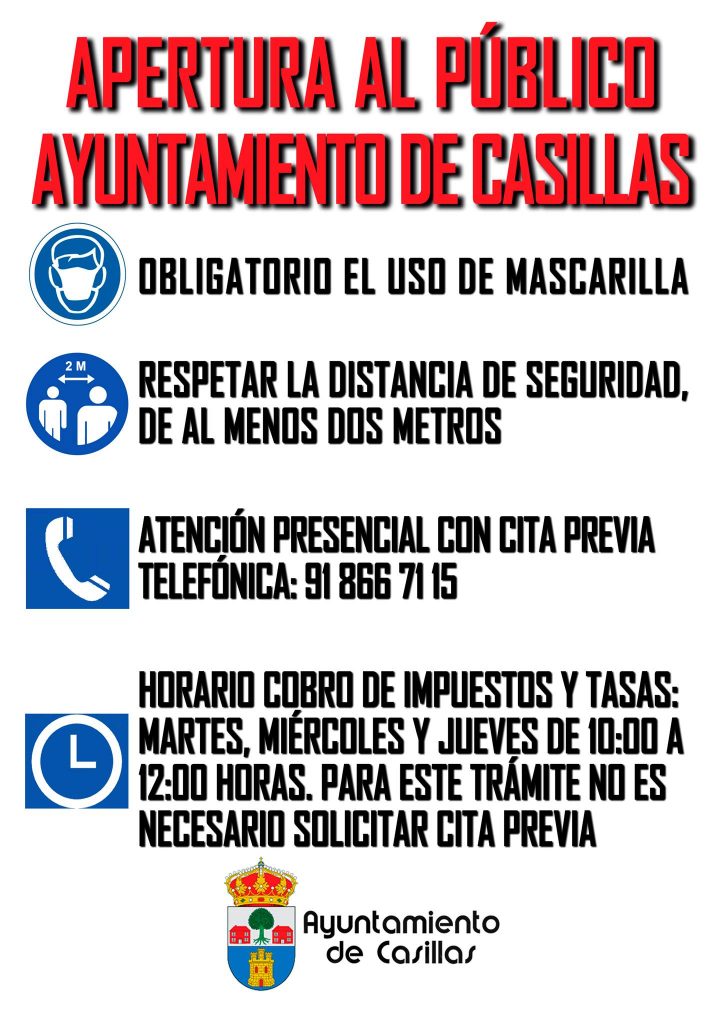 Apertura al público del Ayuntamiento de Casillas Publicación del cartel informativo sobre el sistema de atención al publico a partir del 8 de junio, con la entrada en la Fase 2 de la desescalada.