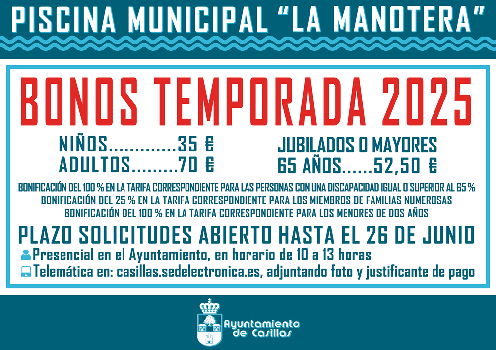 Publicación del cartel informativo sobre el plazo para la presentación de las solicitudes para los bonos de temporada de la Piscina Municipal.