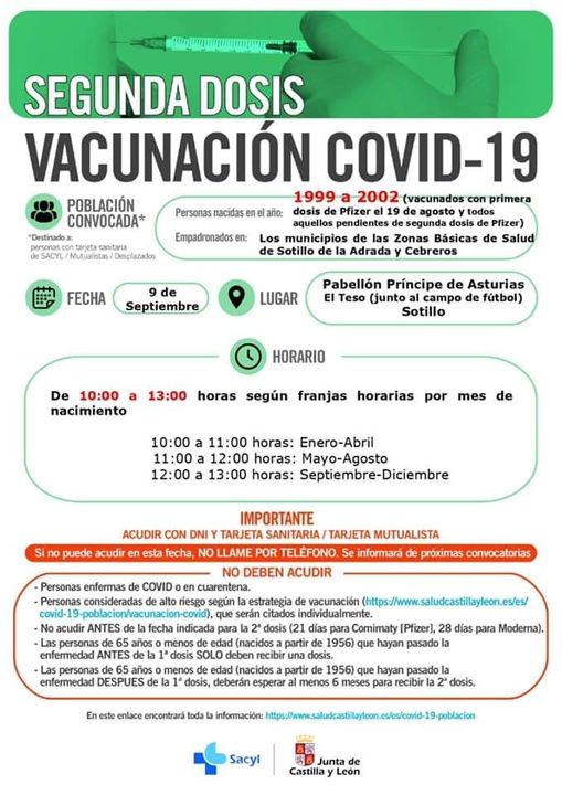 Vacunación Covid- 19 segunda dosis nacidos desde 1999 a 2002 (Jueves – 9 de septiembre)