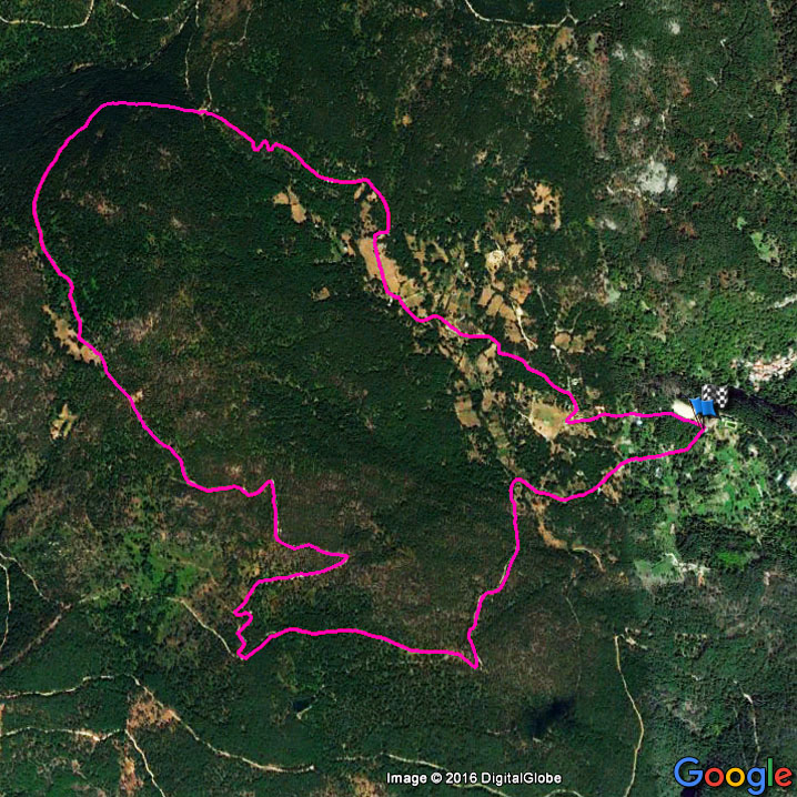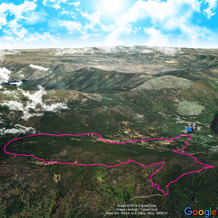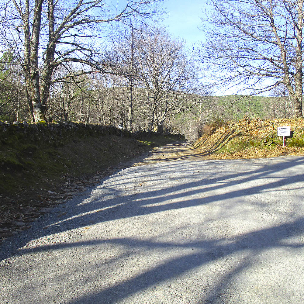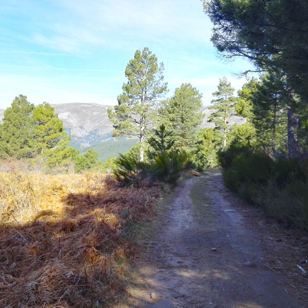 Desde aquí, siguiendo la misma dirección que traíamos, y sin tomar ningún desvío de caminos de menor entidad, iniciamos el camino de descenso hasta el Collado de las Vacas, tras pasar por un pinar silvestre que tapiza fuertes pendientes del terreno en la umbría. Una vez en El Collado, un cruce de cinco caminos, tomaremos el segundo a la derecha, pasando junto a una construcción de piedra que dejamos a nuestra izquierda. Iniciaremos un fuerte descenso, con curvas en zig-zag y que tras pasar la Fuente del Sestilejo, llegamos a una zona de castaños y sin abandonar en ningún momento la pista forestal, avanzando entre castaños y pinos, la pista forestal se convierte en una carretera asfaltada que nos conduce hasta las inmediaciones de Las Eras del Prado por su lado norte, encontrándonos un primer cruce donde tomaremos el desvío a la derecha para inmediatamente dar vistas a las Eras del Prado. En un cruce nada más llegar a las Eras, tomaremos el desvío a la izquierda, que nos conducirá a la Zona Deportiva pasando junto al Museo Etnográfico de La Resina, y un poco más allá el Castaño Centenario, para finalmente acabar la a en nuestro punto de inicio, bien en la Zona Deportiva o en la propia localidad.