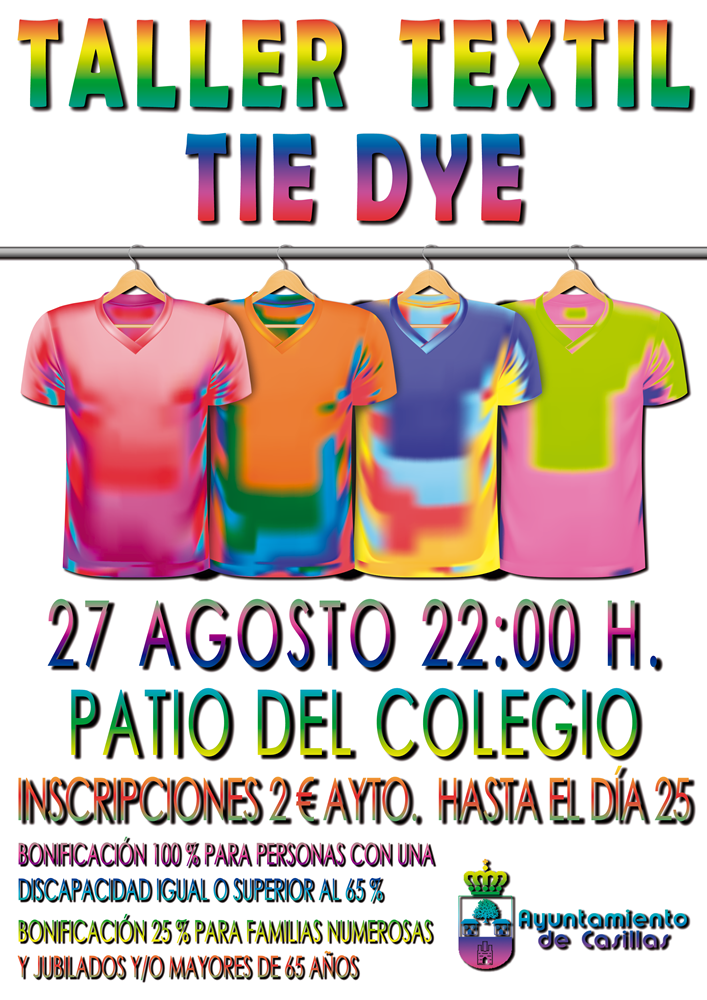 Publicación de cartel informativo sobre el plazo de inscripción para la realización de un taller textil TIE DYE, que se realizará el próximo día 27 de agosto, en el patio del colegio. ¡Vive el verano en Casillas!.